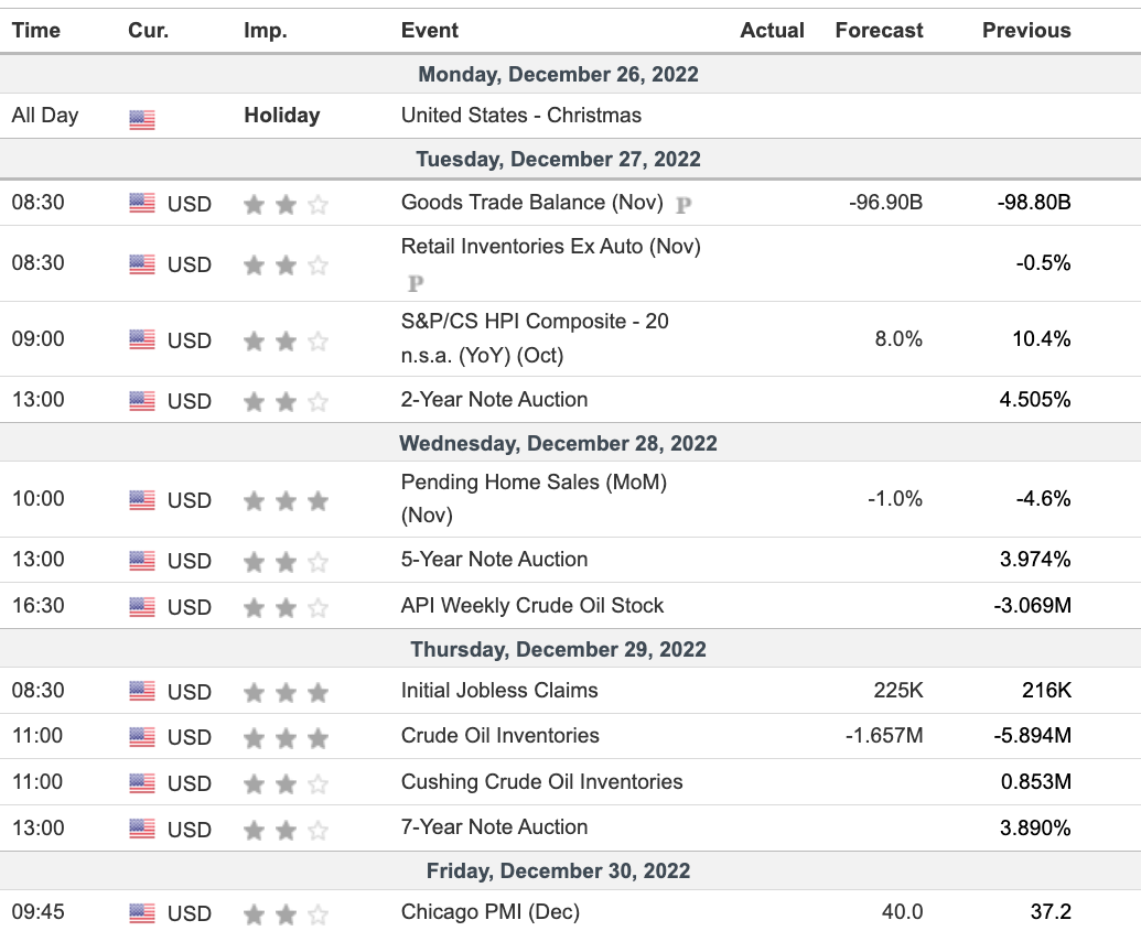 As the year comes to a close there will be many large funds that will need to either close out losing positions or begin rotating into positions for 2023. On top of this, there will be trillions in expiring options and bonds both publicly and privately held, that will help contribute to volatility. While it may be nice to get a quiet week for once in 2022, it seems unlikely it will be this week.