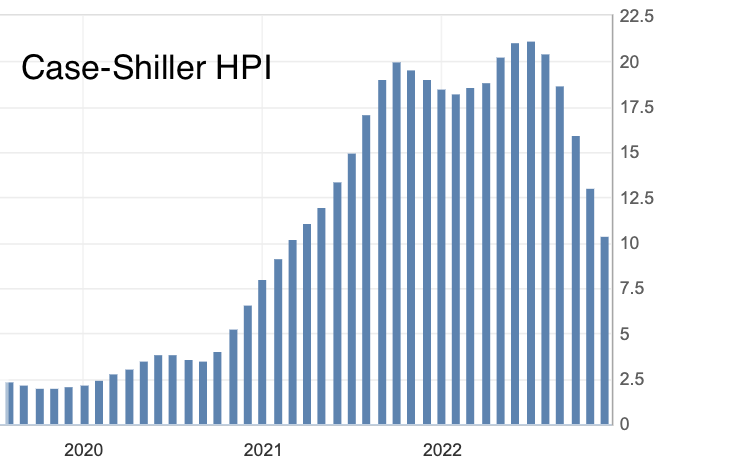 Home prices have begun to collapse as a result of higher interest rates, however they are still trending much higher on a year/year basis than under normal market conditions. Expect home prices to continue to rise at a slower rate, which will be seen as a positive for markets as home prices and rent prices are major components for benchmark inflation indexes such as the CPI.