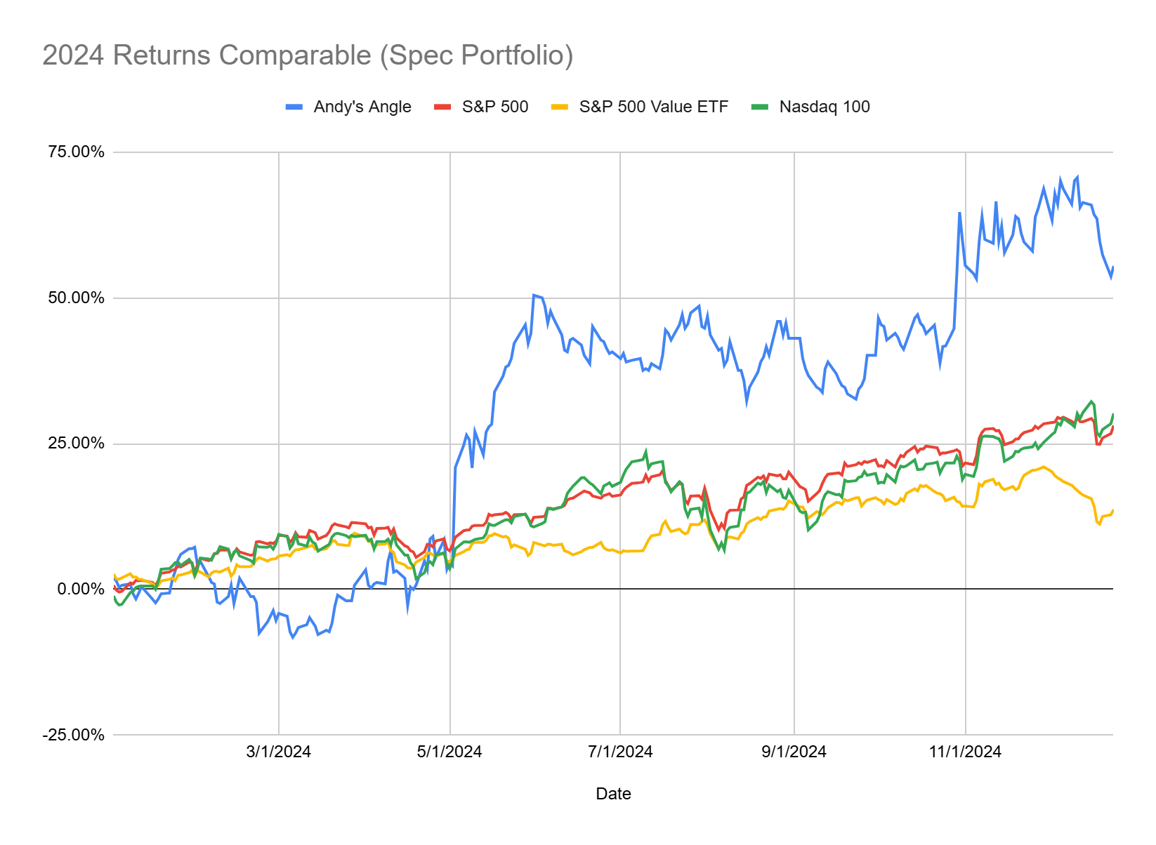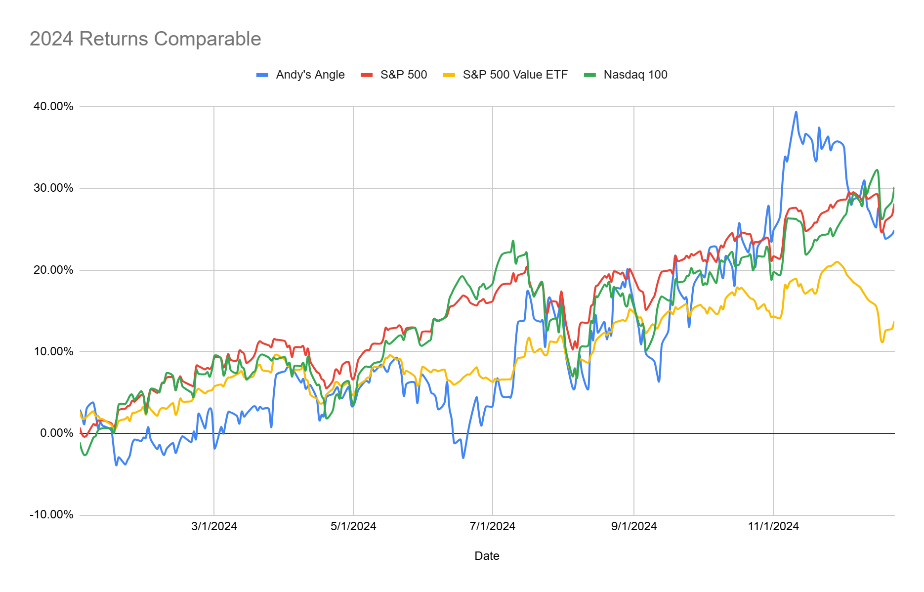 While most index returns were skewed by the top 5% of stocks posting staggering gains (ie. Nvidia, Tesla, etc.), most people managing their own portfolios may not have had this luxury, and definitely not me while managing our portfolios at Andy's Angle.
