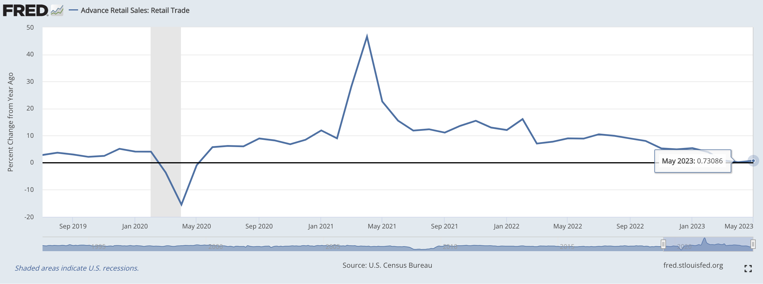 Retail sales remain positive. May retail sales rose 0.7% YoY, up from 0.2% in April, and showing signs of a return to higher growth, in the range of 4-5% that was common pre-pandemic.