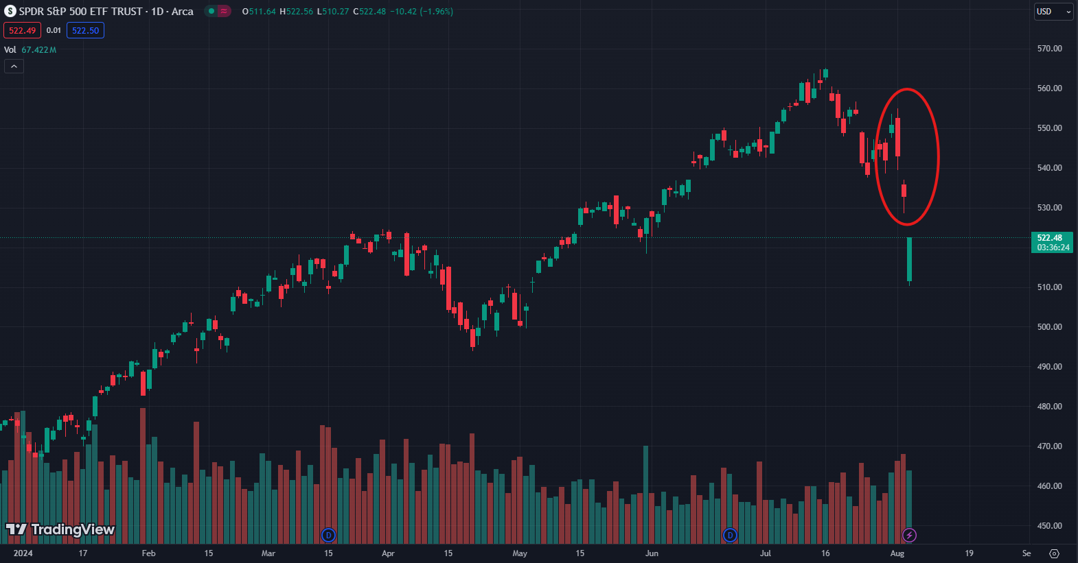 Markets had already been following as recession fears began to creep back into the minds of traders, peaking on Friday after the July jobs print missed badly to the downside, indicating a slower jobs market.