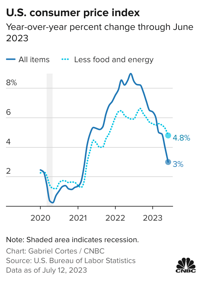 CPI came in at just 3% in June, and more importantly, core CPI finally showed signs of breaking lower, coming in at 4.8% - the first sub 5% print since late 2021.