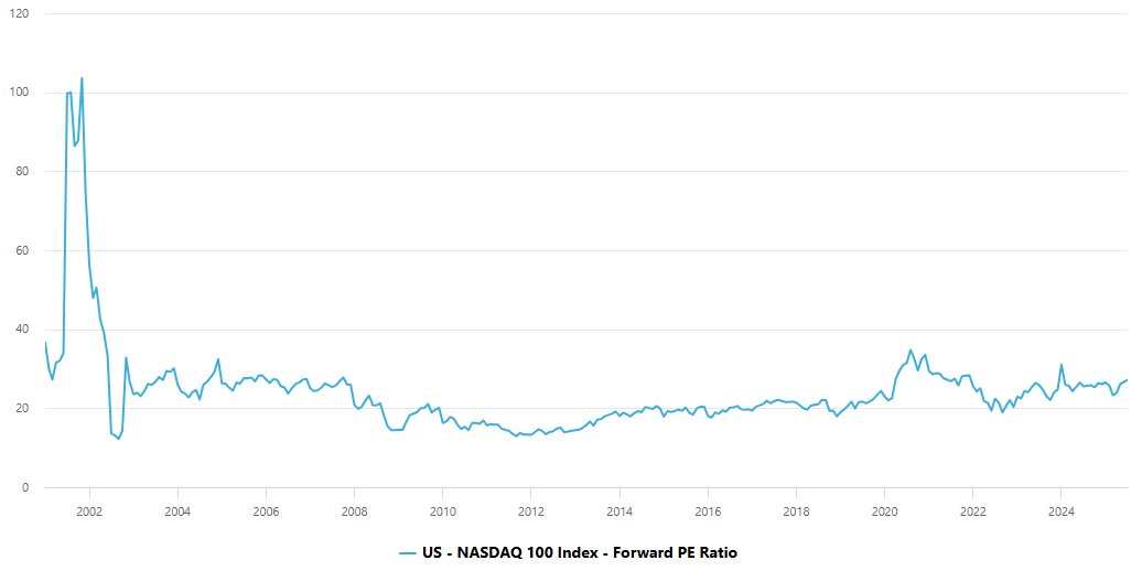This chart tells you all you need to know, and I could end the piece here, but let's take a deeper look. The chart shows the forward PE ratio of the Nasdaq 100, which tracks the top 100 technology stocks on the U.S. market.