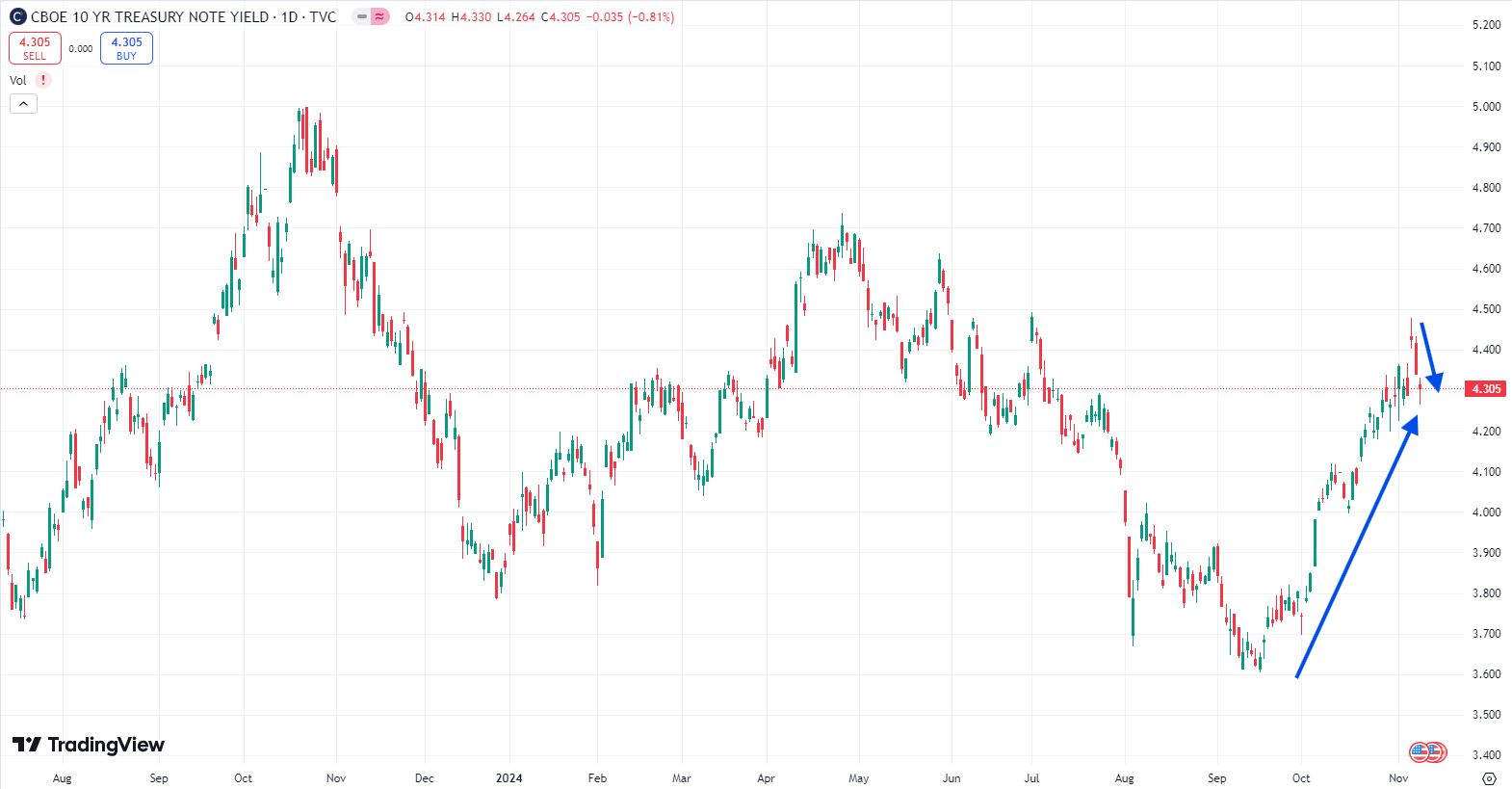 As the chart above shows, the 10yr seems to have created a blowoff top following Trump's election. On election night, yields jumped higher, pricing in the inflationary pulse of the Trump administration as potential tariffs and larger budget deficits loomed. Despite this, yields reversed course as the Fed cut the FFR by a further 25bps later in the week, with Powell hammering home the idea that the Fed has inflation under control.